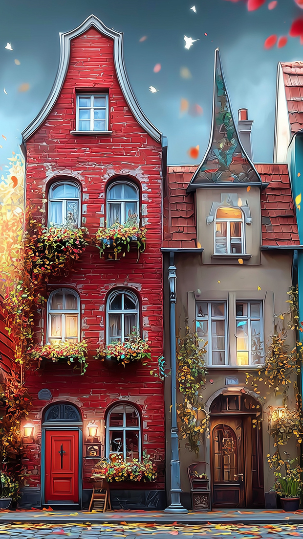 Edytor tapety: Kolorowe kamieniczki w grafice AI