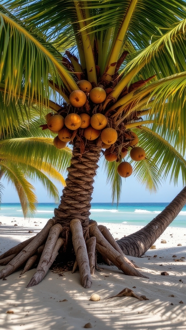 Edytor tapety: Kokosy na palmie na morskiej plaży