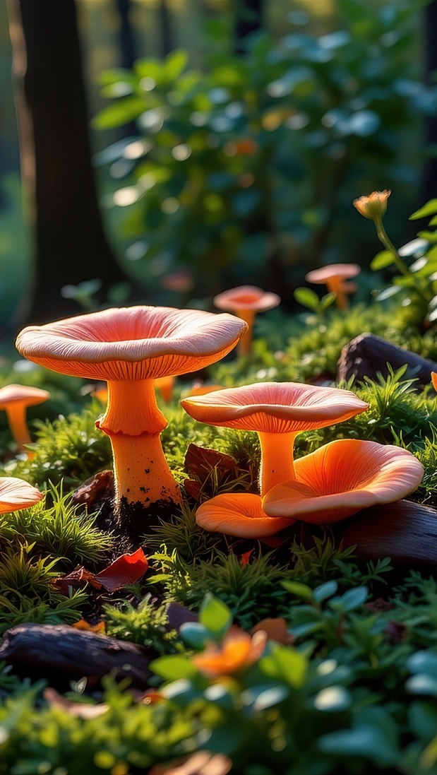 Edytor tapety: Rozświetlone pomarańczowe grzyby w leśnej ściółce