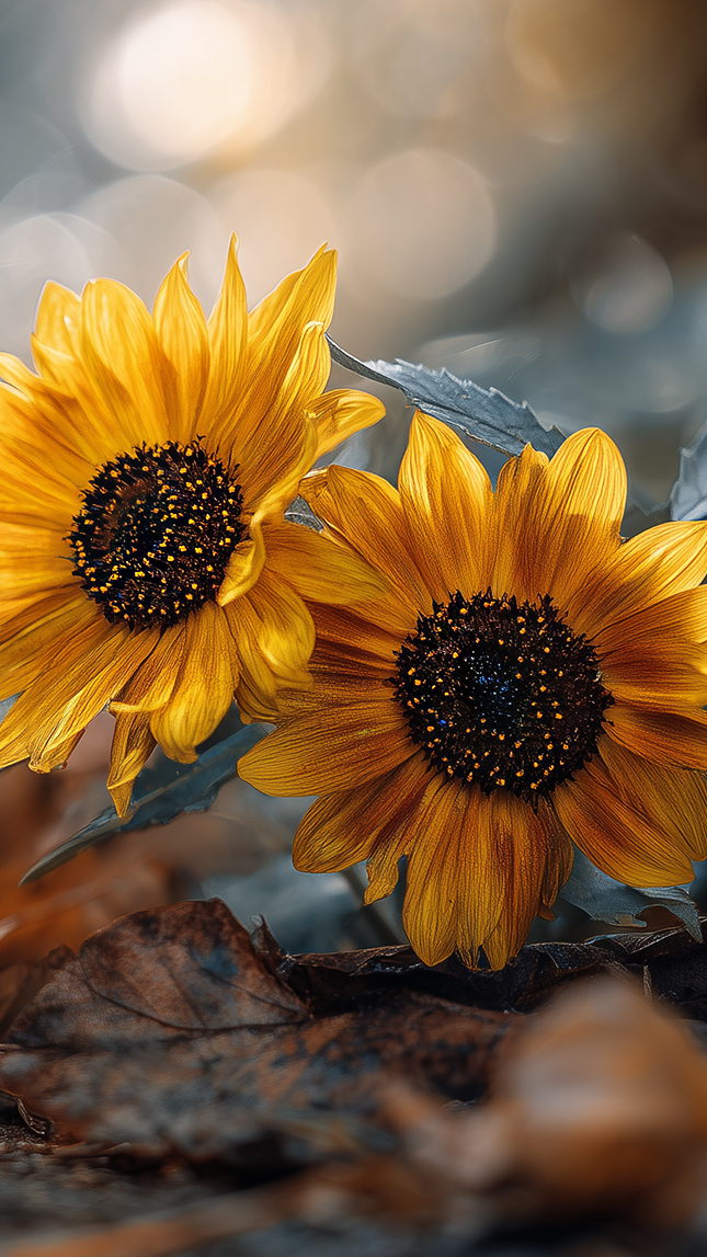 Edytor tapety: Słoneczniki ozdobne na suchych jesiennych liściach