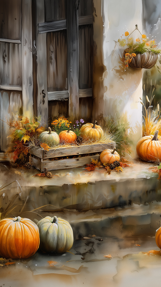 Edytor tapety: Kolorowe dynie w skrzynce na schodach