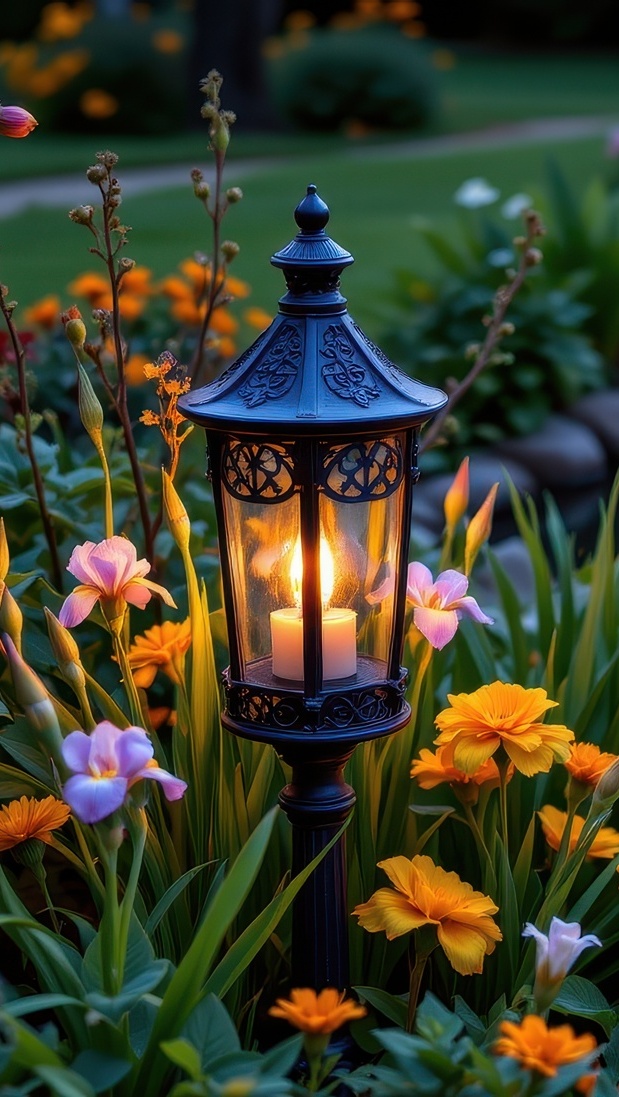 Edytor tapety: Zapalona latarnia wśród kwiatów w ogrodzie