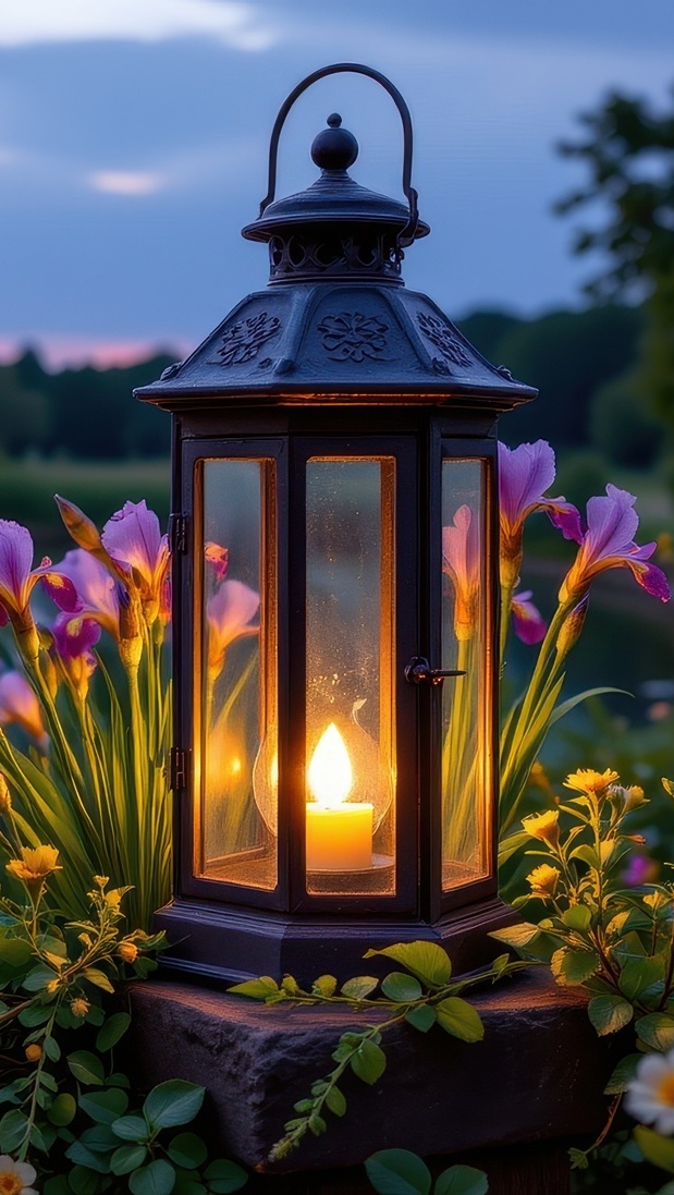 Edytor tapety: Kwiaty i zapalony lampion na kamieniu