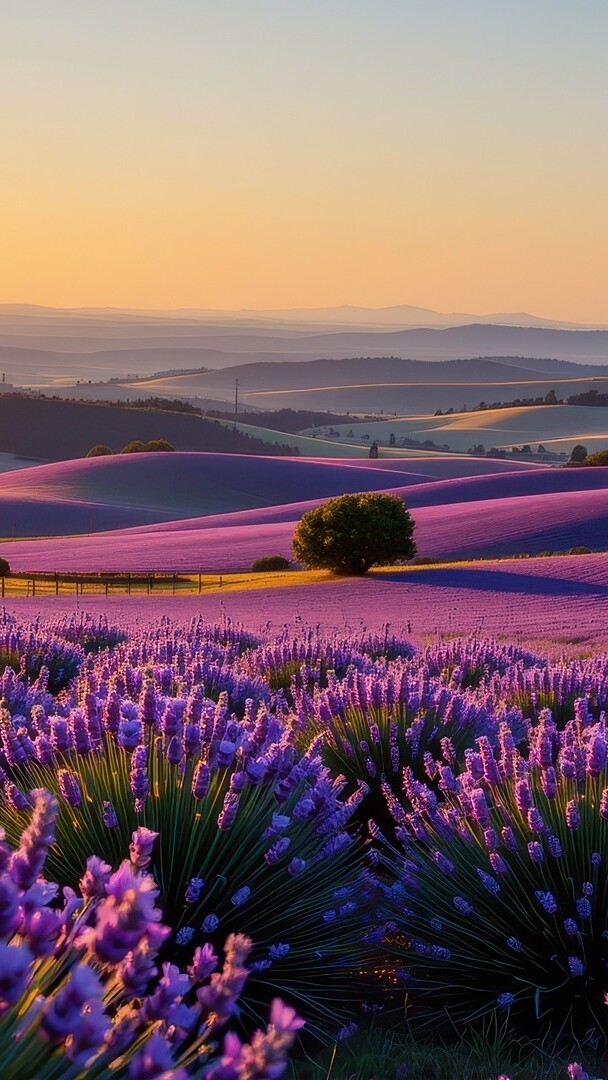 Edytor tapety: Pola lawendy na wzgórzach o poranku