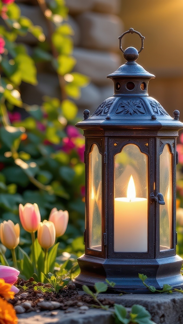 Edytor tapety: Zapalony lampion obok kwiatów
