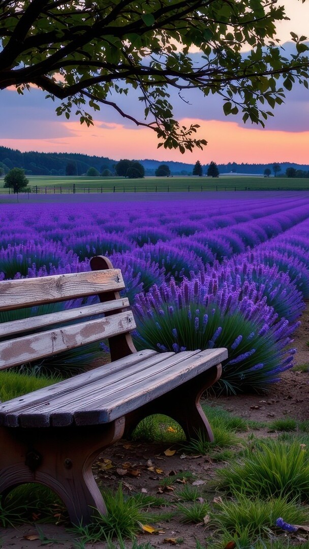 Edytor tapety: Ławka pod drzewem na polu lawendy