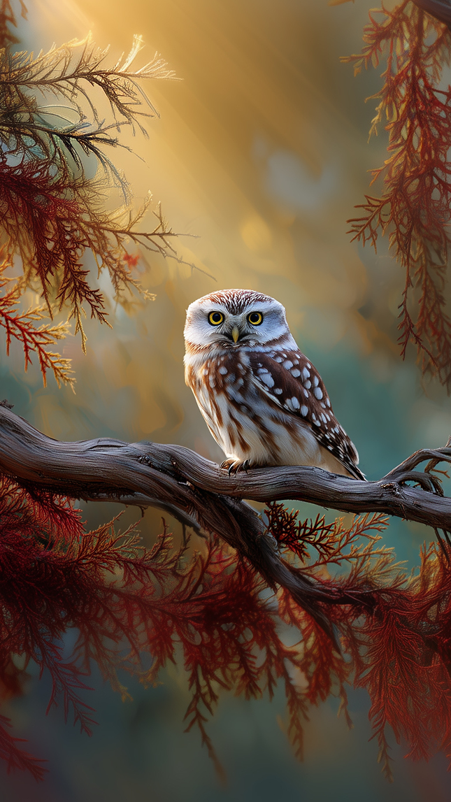 Edytor tapety: Sowa na rozświetlonej gałązce drzewa iglastego