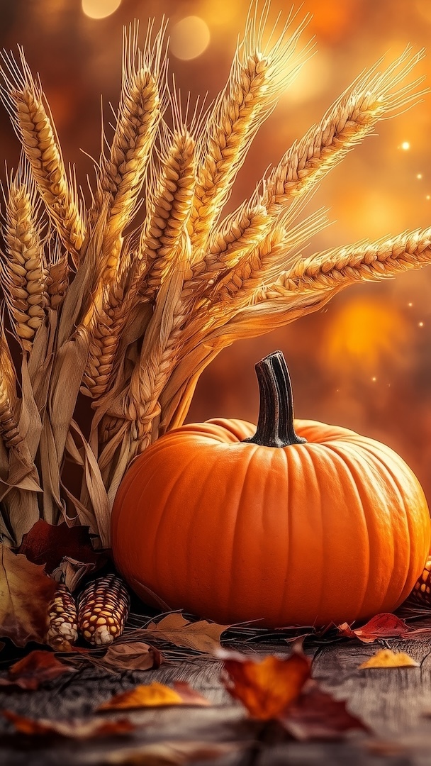 Edytor tapety: Dynia obok kukurydzy i kłosów zboża