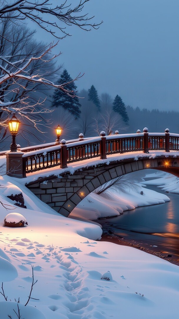 Edytor tapety: Zapalone latarnie na ośnieżonym moście