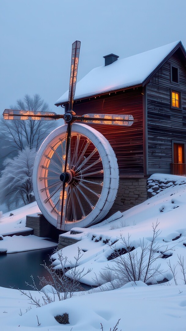 Edytor tapety: Młyn wodny w zimowej scenerii