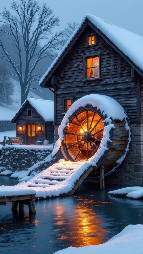 Edytor tapety: Oświetlony młyn wodny nad rzeką