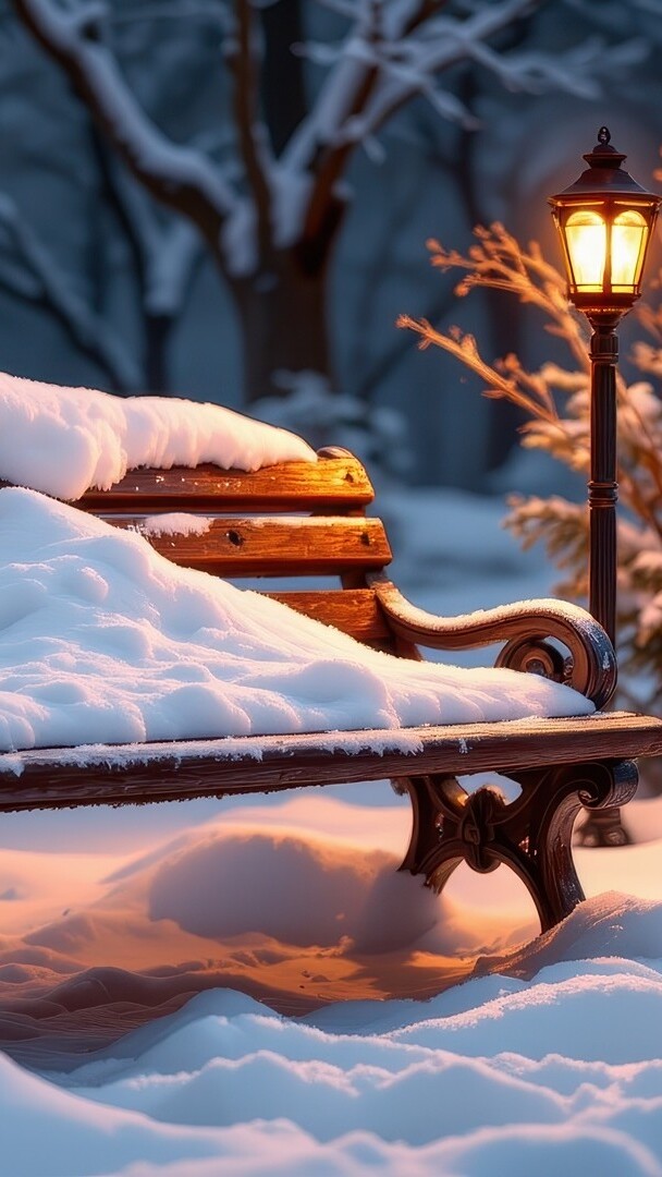 Edytor tapety: Zapalona latarnia obok ośnieżonej ławki