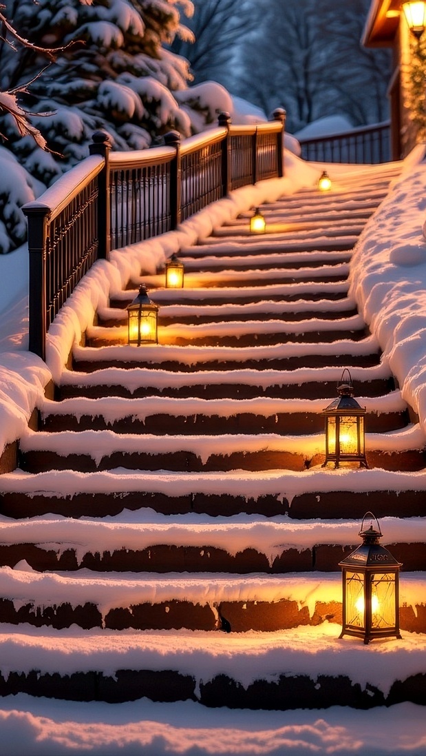 Edytor tapety: Zapalone latarnie na ośnieżonych schodach
