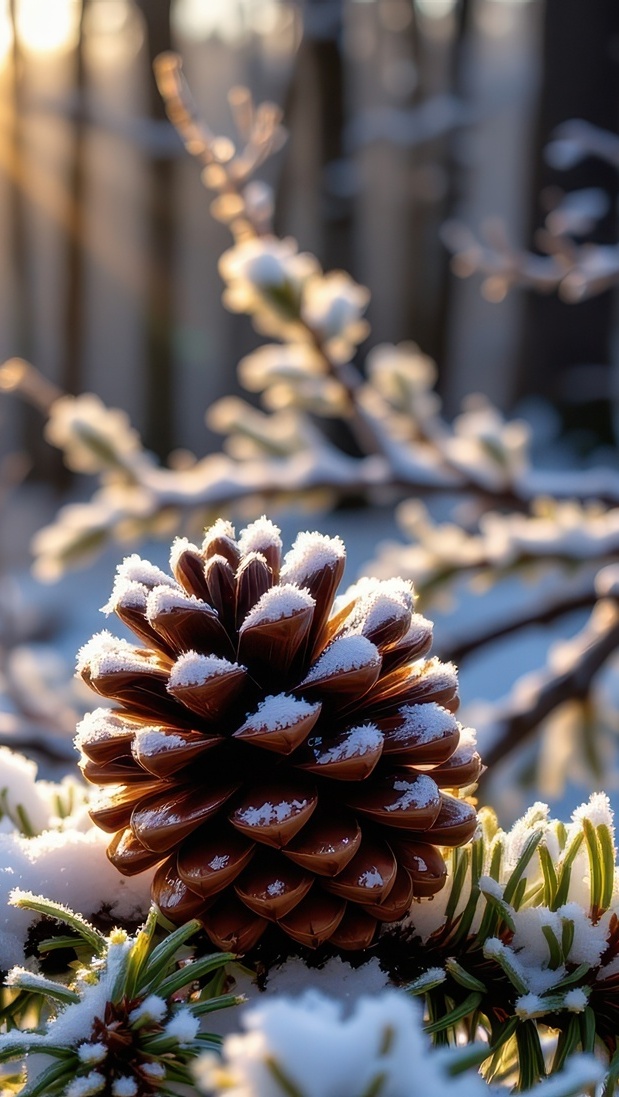 Edytor tapety: Ośnieżona szyszka na sosnowej gałązce