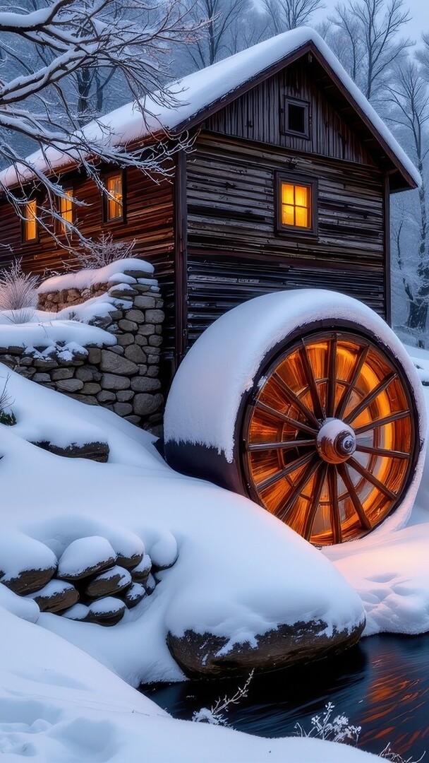 Edytor tapety: Ośnieżone drzewa przy oświetlonym młynie