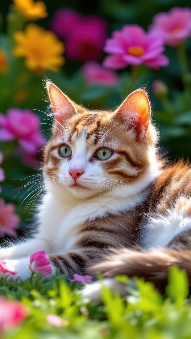 Edytor tapety: Rudo-biały kot leżący na trawie