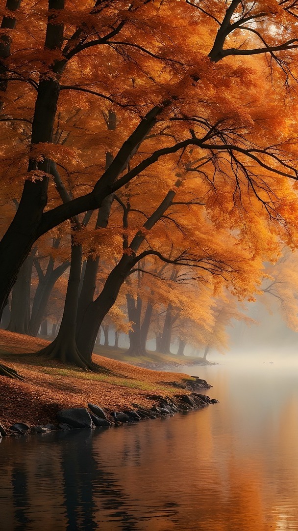 Edytor tapety: Jesienne drzewa nad zamgloną rzeką
