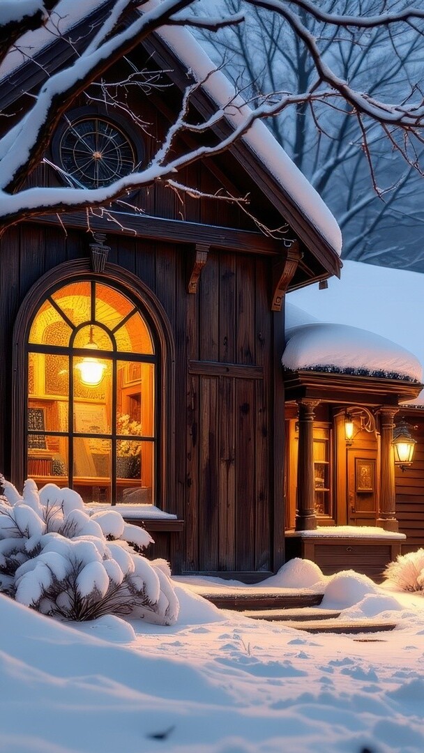 Edytor tapety: Ośnieżone drzewa przed oświetlonym domem