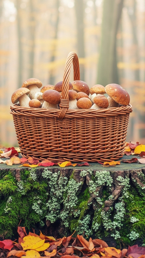 Edytor tapety: Kosz pełen grzybów na omszałym pniaku