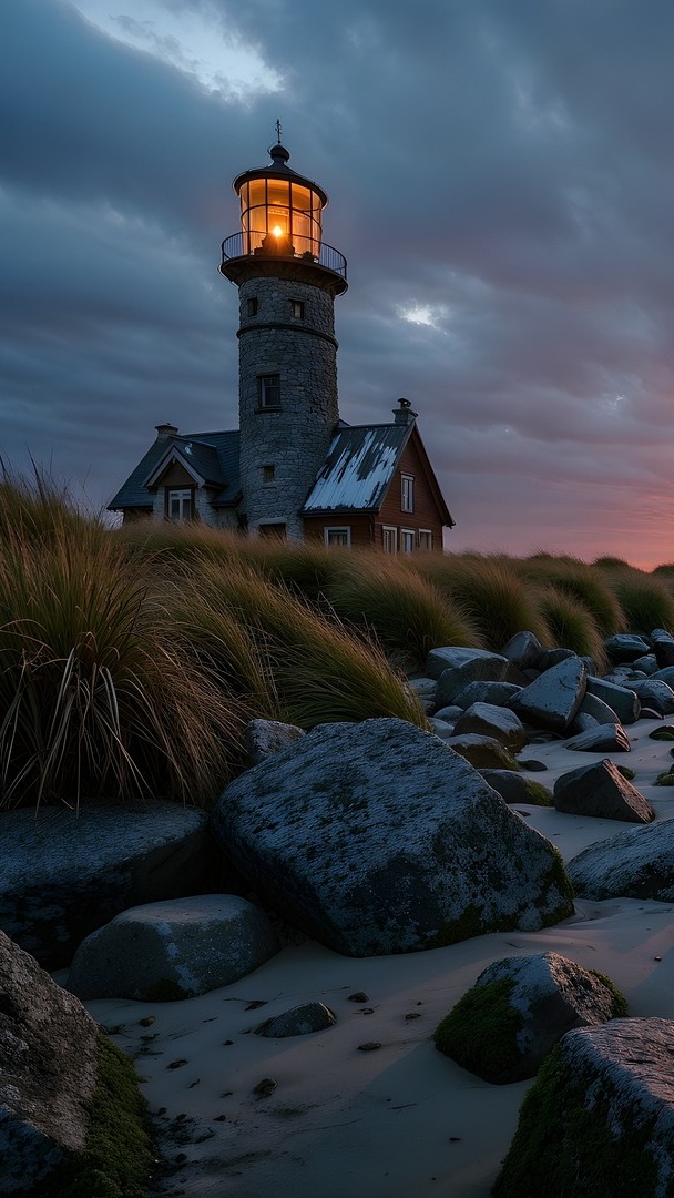 Edytor tapety: Oświetlona latarnia morska pod chmurami
