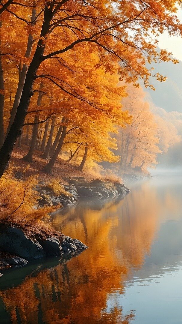 Edytor tapety: Jesienne drzewa nad zamgloną rzeką