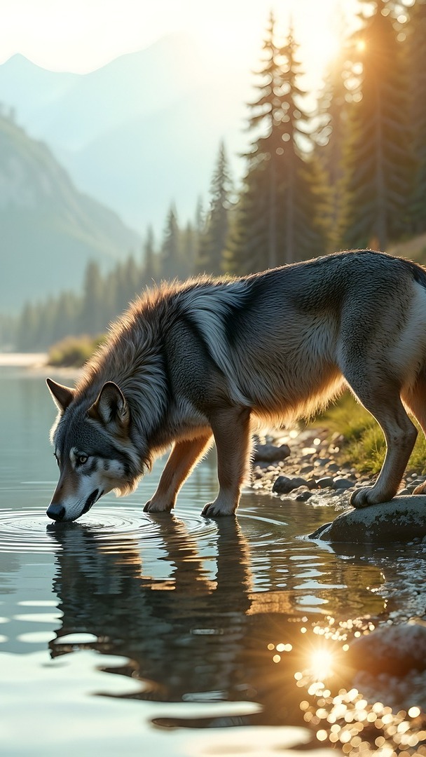 Edytor tapety: Wilk pijący wodę z górskiej rzeki