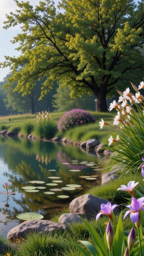 Edytor tapety: Kwiaty i drzewa nad stawem