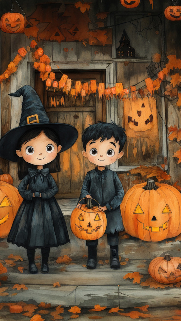 Edytor tapety: Dwoje dzieci i dynie przed domem