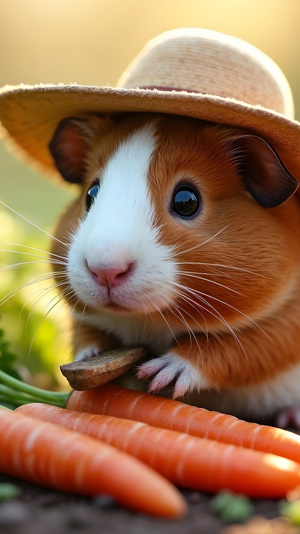 Edytor tapety: Świnka morska w kapeluszu obok marchewek