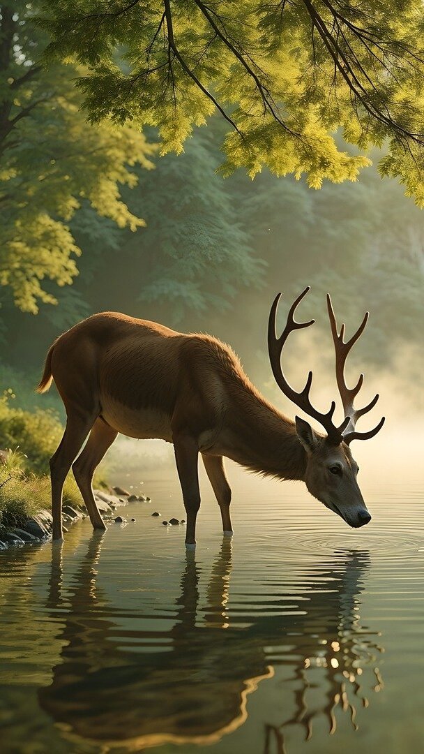 Edytor tapety: Jeleń pijący wodę w jeziorze