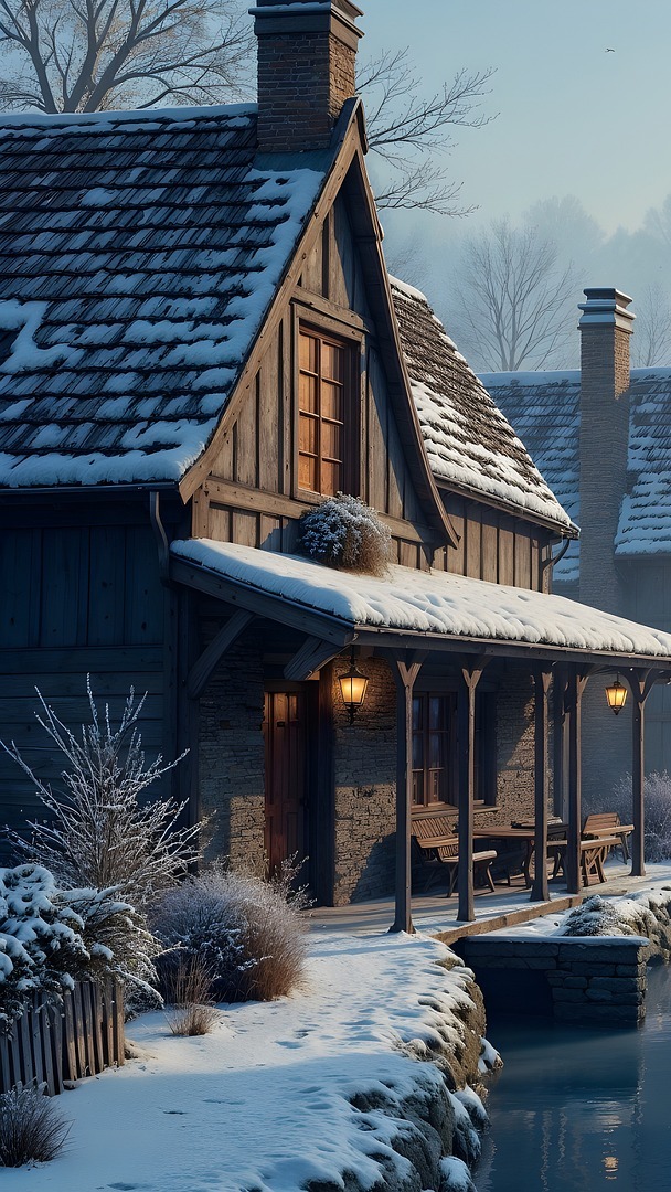Edytor tapety: Ośnieżone domy nad kanałem