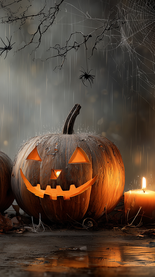 Edytor tapety: Pajęczyna nad świecącą dynią i świeczką