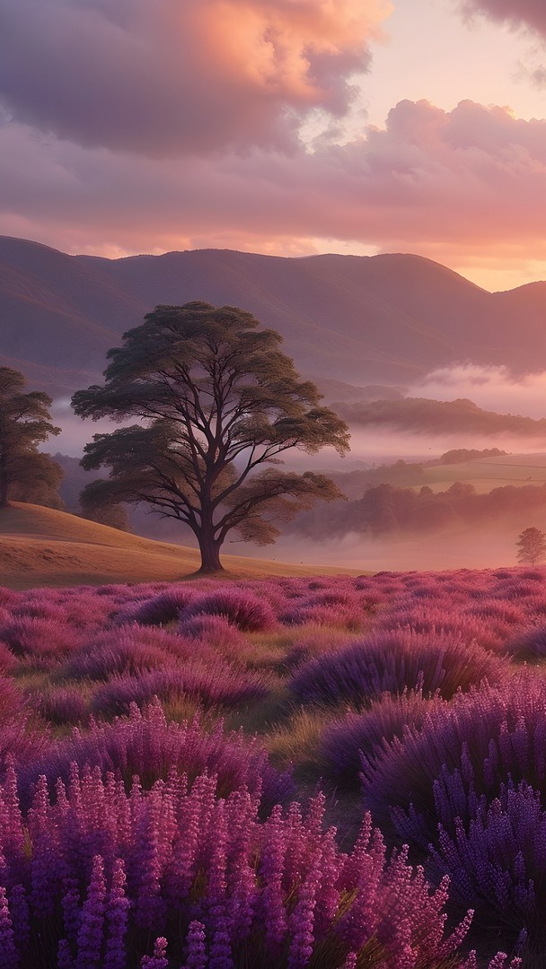 Edytor tapety: Wzgórze wrzosowiska z drzewami we mgle