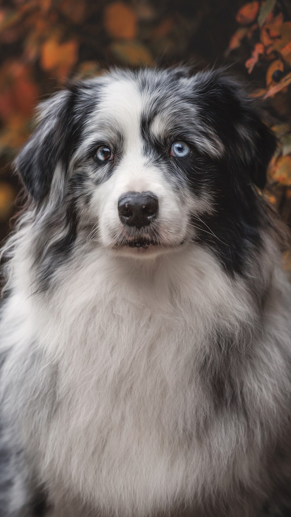 Edytor tapety: Owczarek australijski na tle jesiennych liści