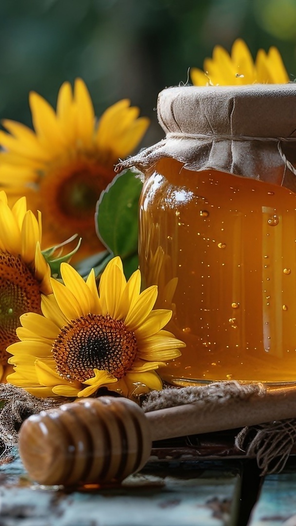 Edytor tapety: Słoik z miodem obok słoneczników ozdobnych
