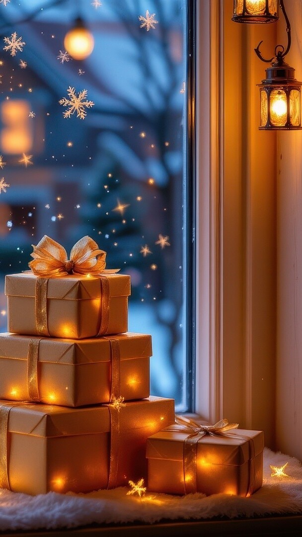 Edytor tapety: Światełka na prezentach na okiennym parapecie