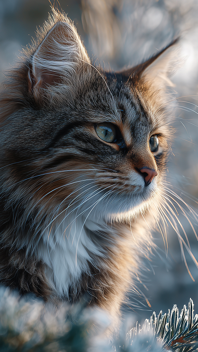 Edytor tapety: Bury kot przy oszronionej iglastej gałązce
