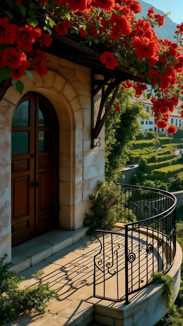 Edytor tapety: Czerwone pnące kwiaty nad balkonem