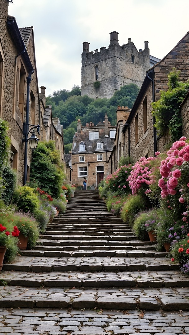 Edytor tapety: Kwiaty obok domów przy brukowanych schodach