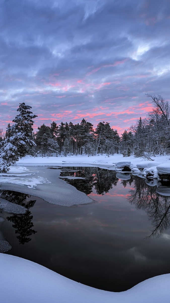 Edytor tapety: Chmury i ośnieżone drzewa nad jeziorem