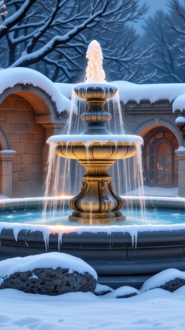 Edytor tapety: Podświetlona fontanna w zimowej scenerii