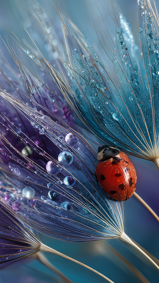 Edytor tapety: Biedronka i krople na mokrych dmuchawcach