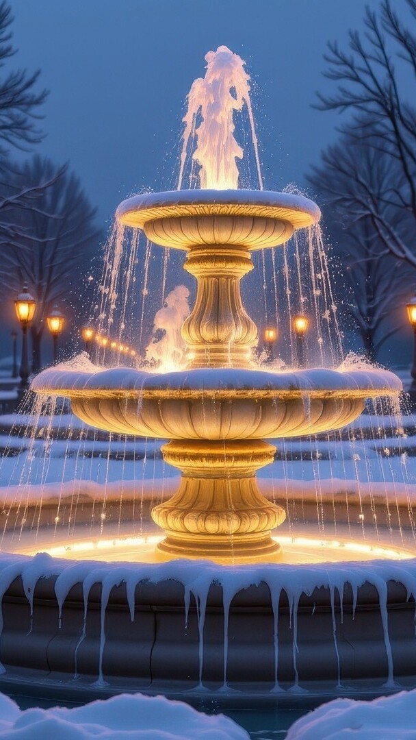 Edytor tapety: Podświetlona fontanna w zimowej scenerii