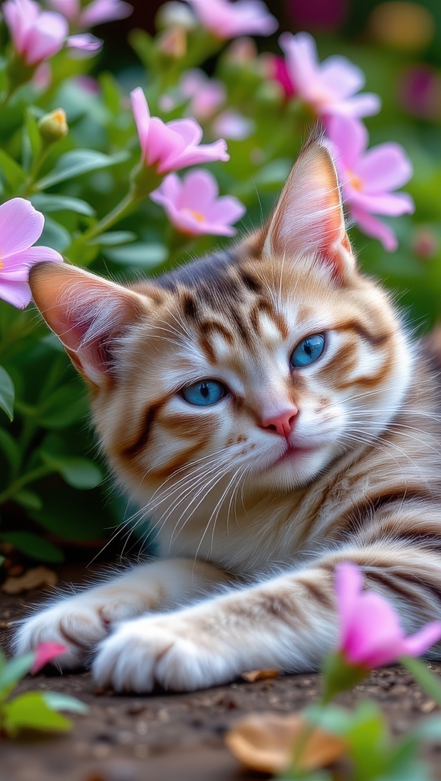Edytor tapety: Pręgowany kot leżący pod kwiatami