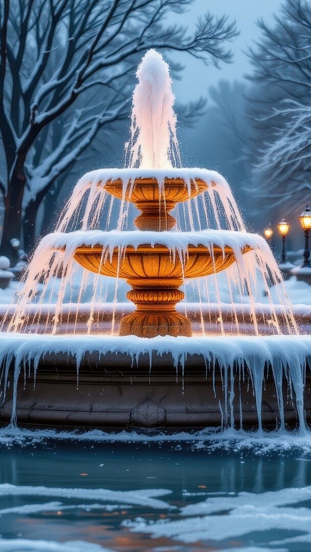 Edytor tapety: Podświetlona fontanna w zimowym parku