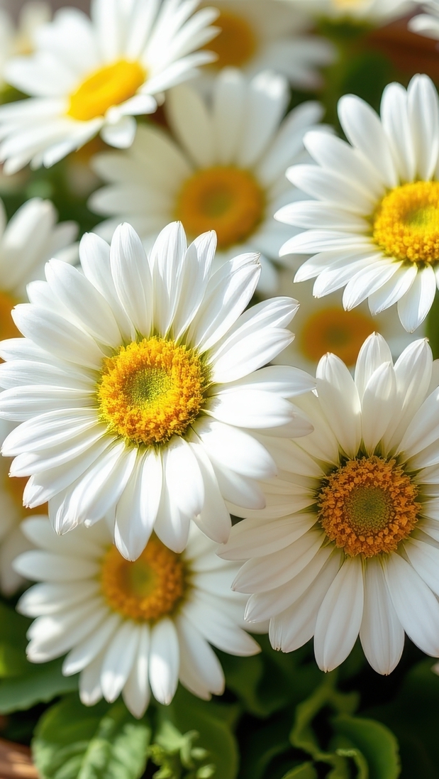 Edytor tapety: Rozświetlone białe stokrotki w zbliżeniu
