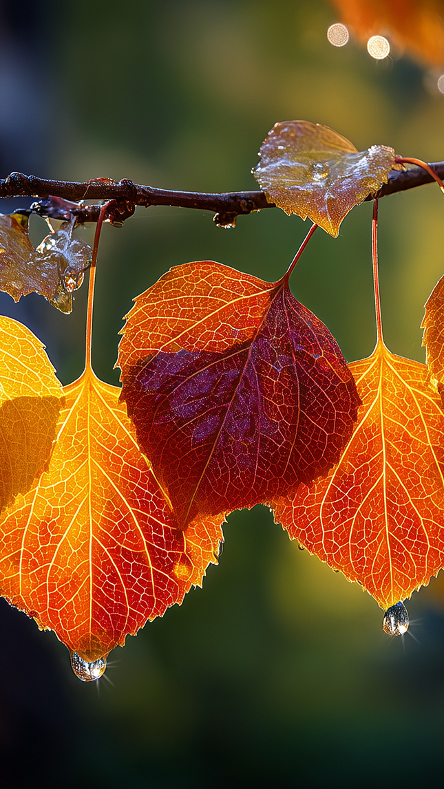 Edytor tapety: Krople na jesiennych liściach na gałązce