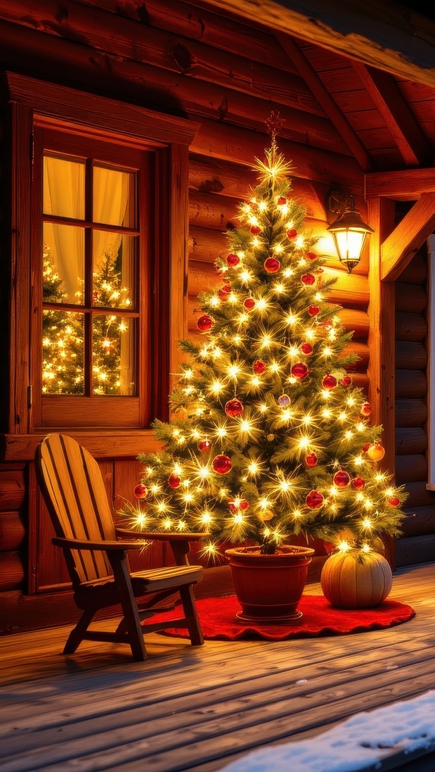 Edytor tapety: Rozświetlona choinka i krzesło na tarasie