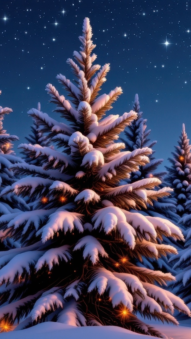 Edytor tapety: Ośnieżona choinka pod nocnym niebem