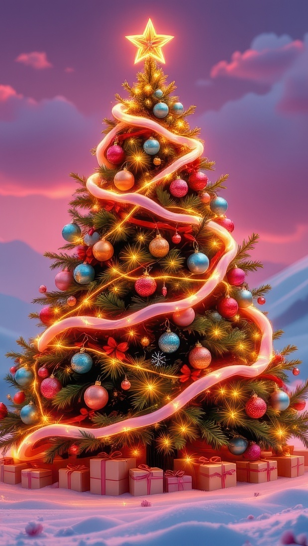 Edytor tapety: Prezenty pod rozświetloną choinką na śniegu